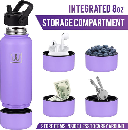 Insulated Sports Water Bottle - 32 Oz Water Bottle with Discrete Storage Compartment, 2 Lids, Straw, Hot & Cold Double-Walled Vacuum Insulated Stainless Steel Gym & Thermos Bottle (Lavender)